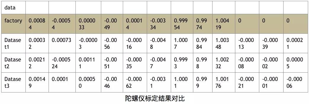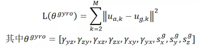 物理意义为当加速度计静止的时候, 他的norm值应该与重力加速度值相等. 使用LM优化方法迭代优化.在得出加速度计参数值以后, 再使用这些参数重新校正所有加速度计值.并进行陀螺仪标定. 陀螺仪的error function为: