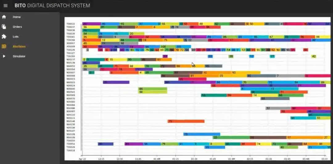 然后在操作界面上,不同的颜色代表不同的订单,而原材料会随着工艺流程,在不同的是时间内,在不同的设备之间进行流转。而这么多的订单,全部的把它编排像玩俄罗斯方块一样,做一个最优化的统筹处理,同时考虑到环节与环节之间的一个搬运的效率,以及库存订单的所有的实时的情况,形成一个大型的运筹优化的智能化的系统,这就是“刘邦”排程系统。