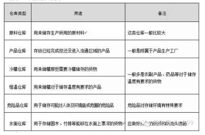 每种货物均有其不同的保管特性,仓库规划人员还可以根据货物的特性设计不同的仓库类型,具体如表所示。