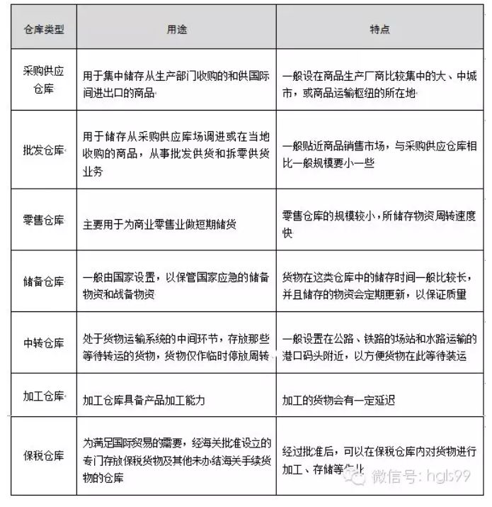 按照用途的不同,仓库可以分为采购供应仓库、批发仓库、零售仓库、储备仓库、中转仓库、加工仓库、保税仓库等,各类仓库的用途及特点如表所示。