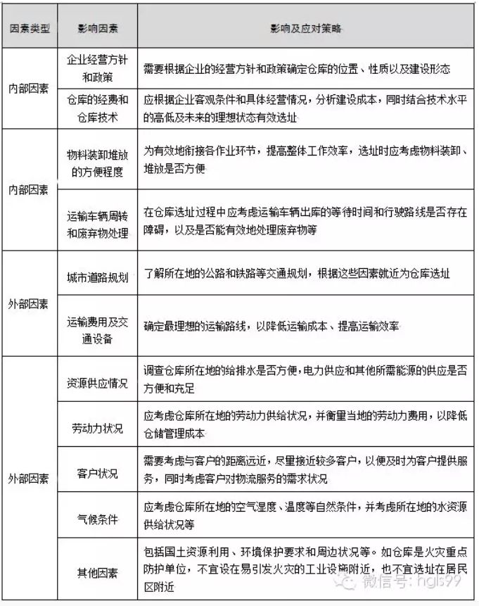 在仓库选址过程中,应考虑经济因素、客户因素、自然因素、社会因素等多种因素。为了方便阐述,将这些因素分为内部因素和外部因素两大类,具体如表所示。