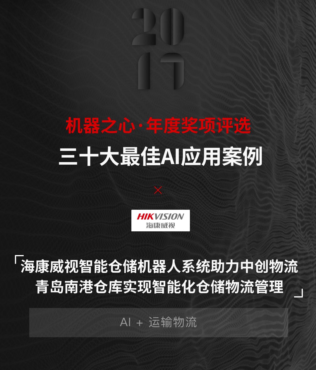 海康威视智能仓储机器人系统助力中创物流青岛南港仓实现智能化仓储物流管理,项目获“2017机器之心全球三十大AI应用案例”。