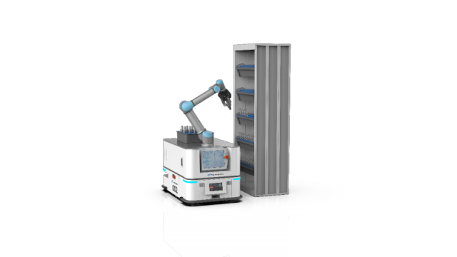 如果应用场景有更为柔性的自动上下料需求,斯坦德的机械臂解决方案将能很好地解决这一问题。支持机械臂的激光导航AGV是一种新型应用,可实现物料的自动化上下料功能,这种方式减少了人的参与,有利于提高产线的工作效率。