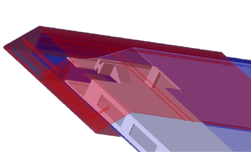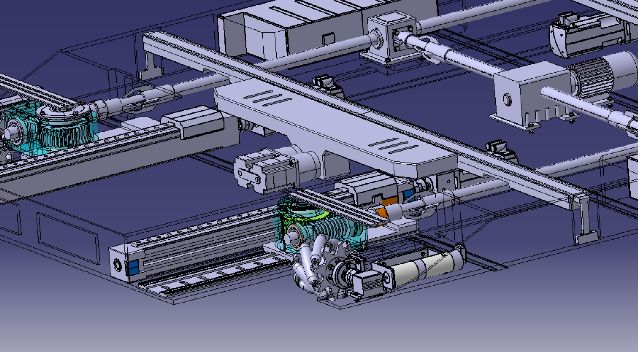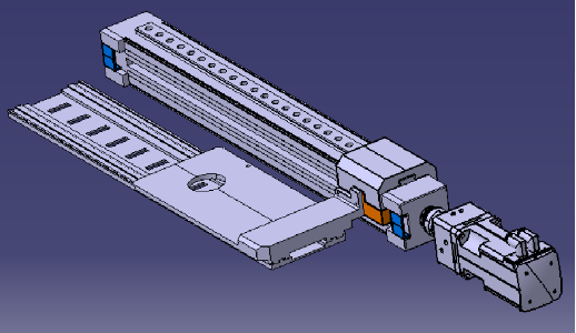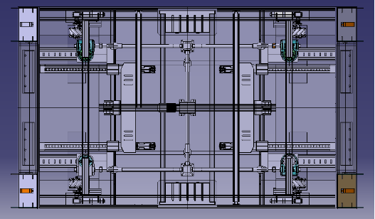 2. 中间移动层(蓝色,分为上下两部分,上部可与下部相对竖直方向移动,下部与内层纵向固定,可横向相对位移,动力源:横向齿条式滑轨)