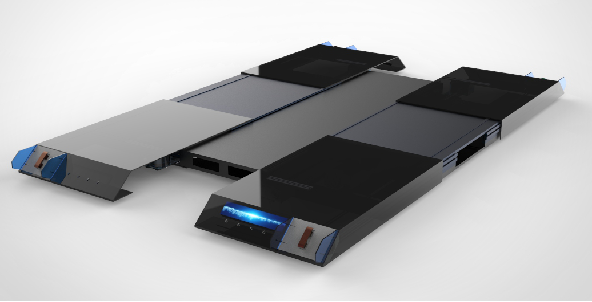 智能换电两种搬运模式:智能泊车AGV搭载两块锂电池,并独立供电,当其一电量耗尽时,向调度中心发出请求换电信号并使用另一块锂电池供电,待换电处空闲时,驶至换电处,只需外层车身纵向展开,即可自行更换满电电池。