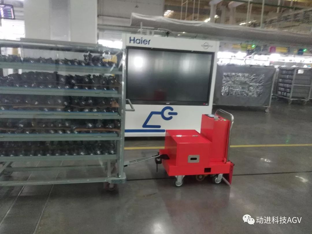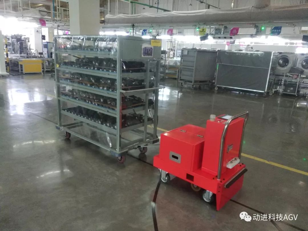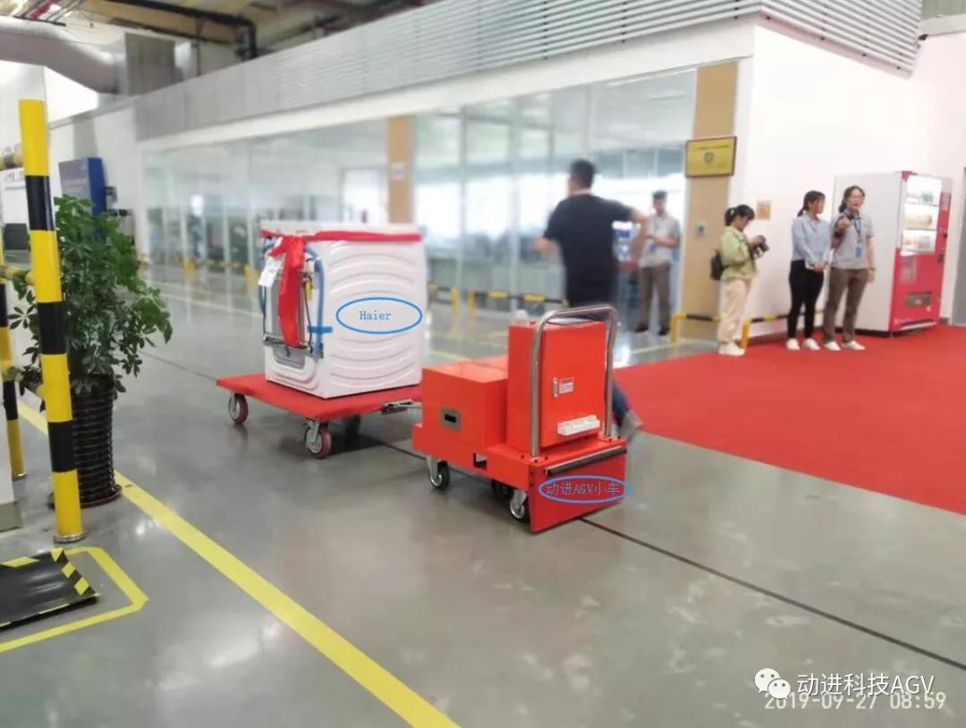 在海尔产线的智能化过程中,海尔使用了深圳动进智能科技的AGV小车产品,2019年9月,动进AGV智能小车在海尔高端滚筒洗衣机、GEA新品下线现场实施后,动进AGV开始忙活起来了(如图)。无人值守、自动搬运的自动化特点使得产线的效益明显提升。