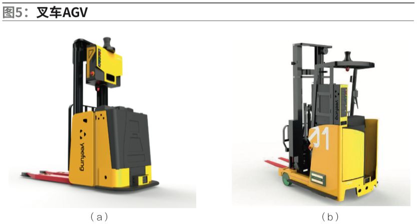 与激光导航的叉车AGV。叉车AGV有前移式(图5a)与堆高式(图5b)。