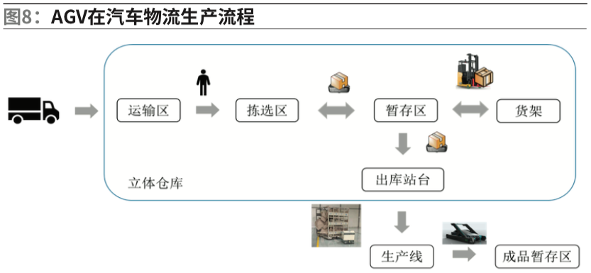 AGV在各行各业都有广泛的应用,尤其是物流和制造行业。在物流行业较为出名的就是亚马逊的kiva系统,物流对订单智能拣选运送,大大提高物流效率。在汽车制造业中也有应用的研究。但大多数在汽车制造行业都是在汽车生产线中大量使用AGV运送物料,很少有将AGV应用在立体仓库和生产线之间、生产线与成品缓存区之间的运送。本文主要表述AGV在汽车生产物流上的应用。