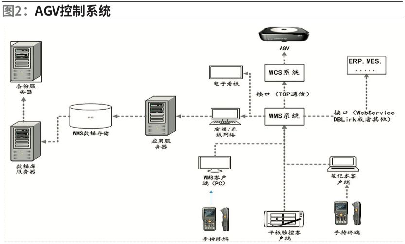 图2是AGV在立体仓库中运行的原理图。整个AGV控制系统通过外接操控设备(平板、手持终端等)发布具体搬运任务,由WMS(Warehouse Management System,仓库管理系统)发布任务给WCS(Warehouse Control system, 仓库控制系统)协调各种物流设备运行。