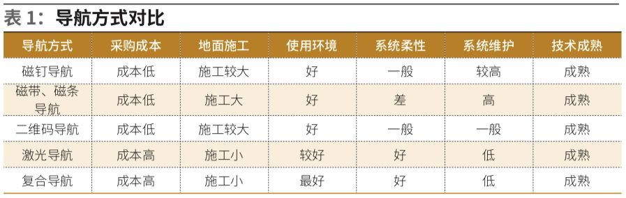 汽车生产物流线上的运行环境有很大差别,需根据现场环境,选择合适用途和导航方式的AGV(表1)。