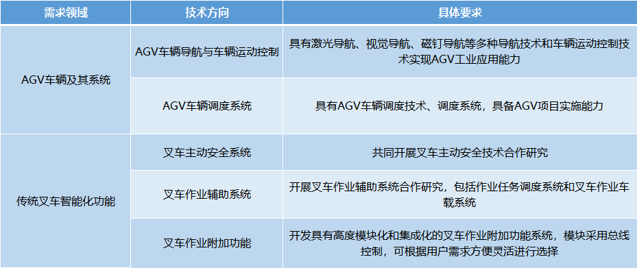 招募企业方向本次需求领域包括AGV车辆及其系统、传统叉车智能化功能两大领域,AGV车辆导航与车辆运动控制、AGV车辆调度系统、叉车主动安全系统等方向。具体技术需求如下: