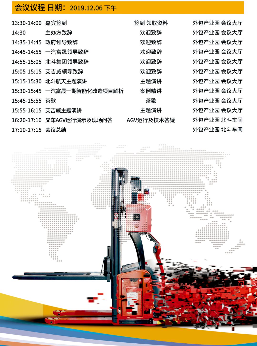 在此背景下,由一汽富晟集团、北斗航天汽车、苏州艾吉威主办,吉林壹嘉科技承办的“智慧物流·智能AGV技术交流会”将于2019年12月6日在长春高新国际服务外包产业园召开。此次峰会将围绕智能制造、工业机器人、人工智能、5G等话题进行深入探讨,推动新技术、新模式、新解决方案以及无人仓运生态联盟的建立与完善。