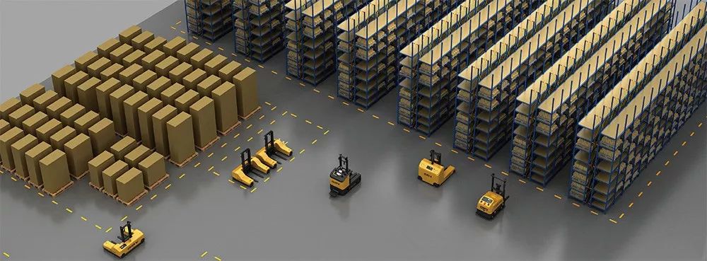 货物托盘转运上货架,使用WMS调度系统,前移叉车根据指令通过规划好的路径运送托盘放入指定货架,由智能叉车系统控制实现叉车的双车调度,实现自行进入指定位置,并能够自动归位,回到停放区。