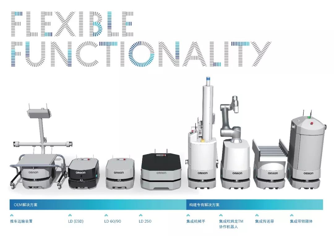 欧姆龙的移动机器人解决方案极其灵活,可用于执行各种任务和应用。产品还具有可扩展性,例如集成机械手、集成协作机器人、集成传送带、集成带锁箱体等等,适应装配站、洁净室、装卸码头、仓库等不断变化的环境。