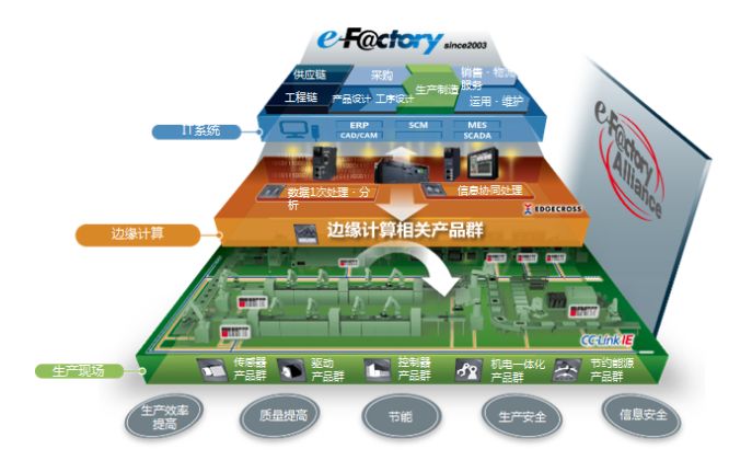 三菱电机秉承“Changes for the Better”的企业经营理念,推出了FA-IT整合解决方案e-F@ctory,通过IoT将开发和制造、物流等领域的所有机器和设备联系起来,分析并且灵活运用所收集的海量数据,从而实现“工厂全面最优化”。