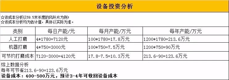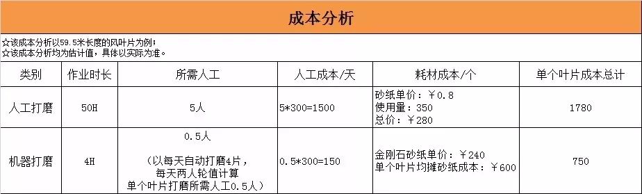 风能叶片自动打磨解决方案:自动打磨系统拥有很高的打磨效率,打磨一个叶片的时间仅需3-4小时,其打磨效率是人工打磨的10倍以上,可24小时作业,无职业健康风险,预计2-4年可以收回设备成本。