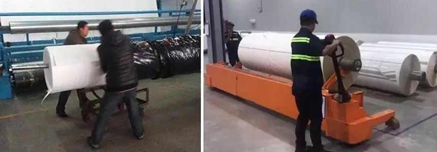 现有的生产车间布料卷筒进行搬运时,一般是将其放置到平板推车上进行搬运,而平板推车一般比较低,需要人工将布卷从平板上抬起,费时费力,效率低,人工劳动量大。