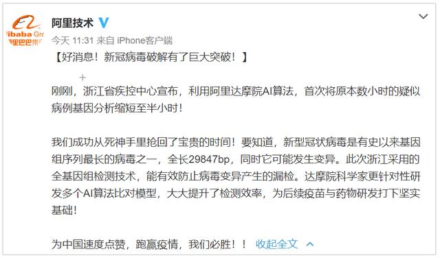2月1日,由阿里巴巴达摩院和浙江疾病预防控制中心等机构研发的新冠肺炎检测分析平台正式上线,常规人工需要12小时才能确诊一例新冠肺炎患者,经过阿里的技术加持,缩短至2小时。疫情期间,这一平台还向全球公共科研机构免费开放一切AI算力,以加速本次新型肺炎新药和疫苗研发。