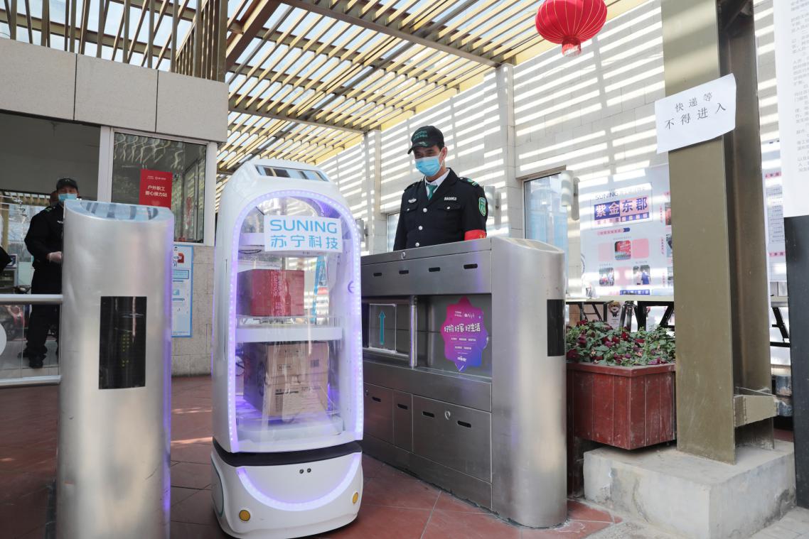 2020年新冠肺炎疫情期间,多地小区实行封闭式管理,快递、外卖等不得进入。苏宁借助人工智能、AI、大数据等科技力量,推出社区机器人协助配送计划,快递员配送至小区门口后,交由已经消毒的机器人小biu将货物送至消费者家门口,其间机器人可以自行判断路线、乘坐电梯、以及提醒消费者取货,完全实现“无接触式配送”。