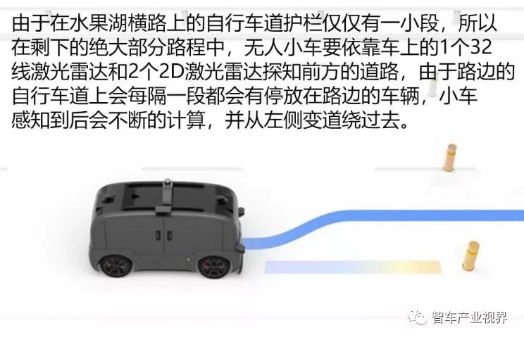 由于这条路并不是正南正北,因为无人小车在通过这条路时,一直在通过车上搭载的16个超声波雷达和1个双目相机、4个宽幅广角相机探知两侧的护栏,并不断调整行进方向。
