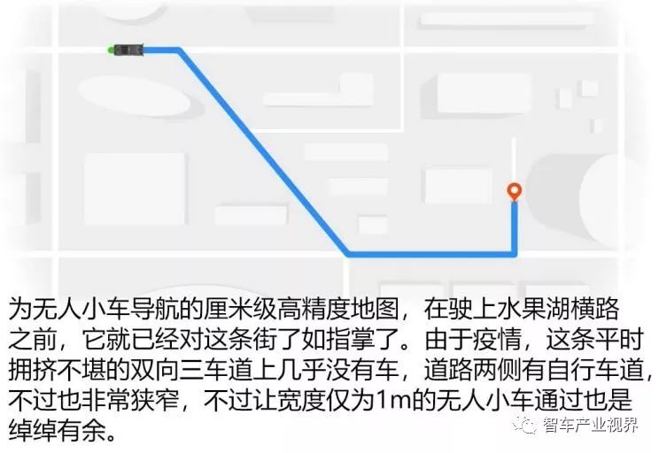 接收到食品之后,无人小车开始这趟派送任务。通过RTK(实时动态)和IMU(惯性传感器)的高航系统,小车选择了从水果湖横路一路向东北方向行驶,经东湖路过楚河,再由楚汉路向西北行驶达到汉街壹号公馆南区的1号门。