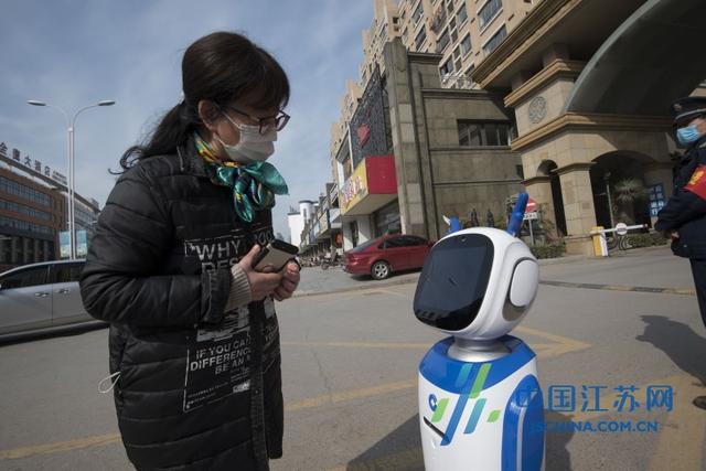 中国江苏网2月19日南通讯(记者 曹敏 摄影 徐劲柏)2020年2月19日,在南通海安市江海东路,一台机器人在街头宣传防疫知识,吸引了路人的目光。据悉,这台机器人来自中国建设银行海安支行,该行在上级行的支持下,将原本在营业大厅用于客户分流引导的“小龙人”机器人,进行了新冠肺炎防疫宣传知识的后台设置,并将其安排到人流量较大的街道和社区开展防疫宣传。