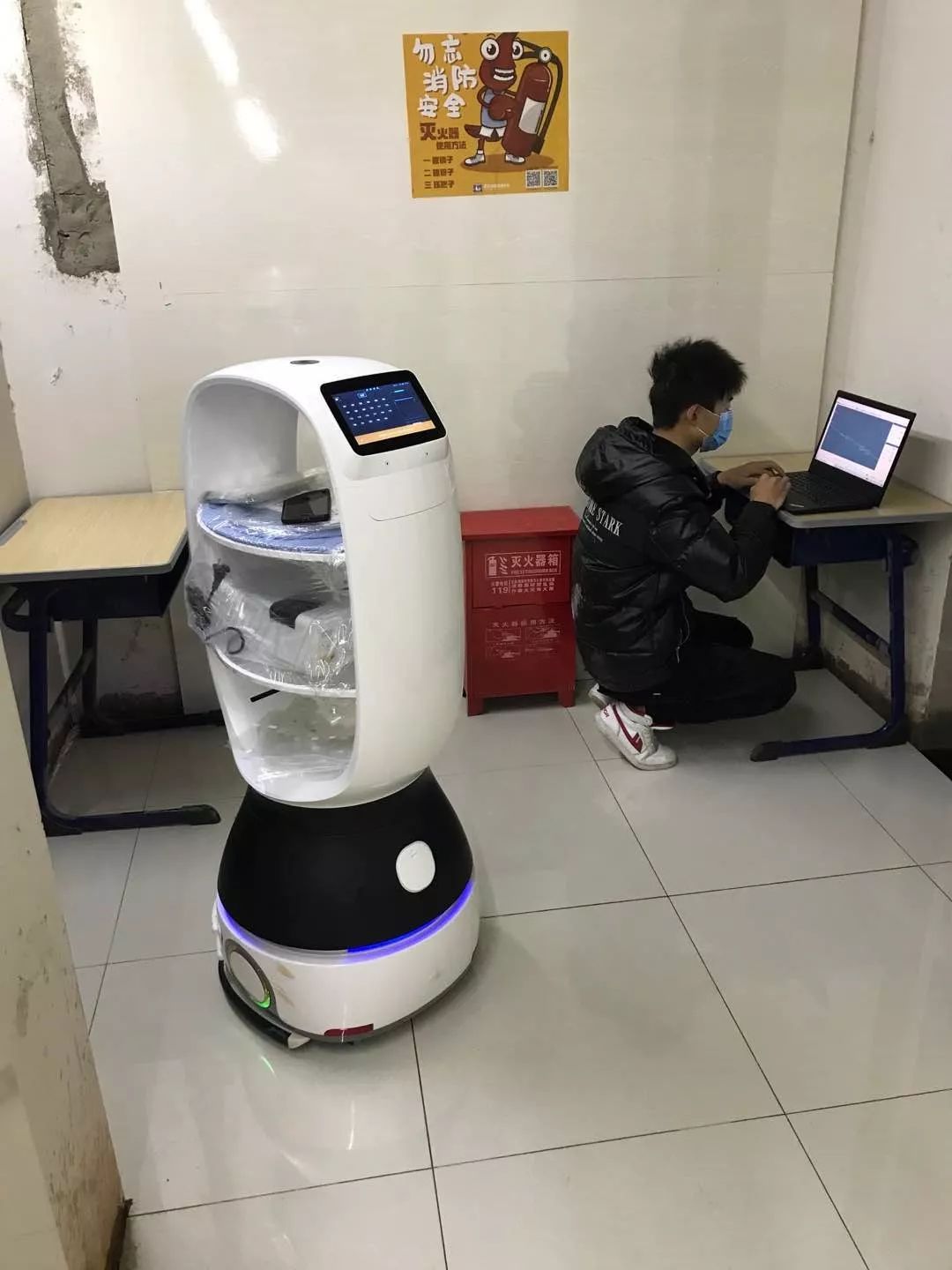 16点25分,擎朗技术工程师刘康与省委党校方舱医院对接:机器人送达并部署。