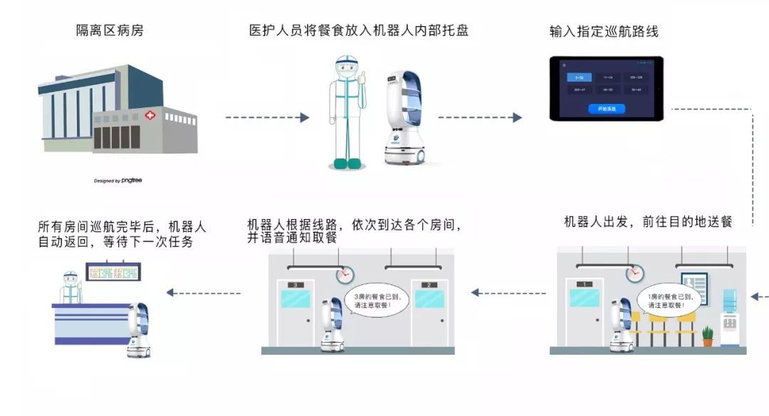 病人取餐后即刻抵达下一个病房(2号)送餐,全部送完后自主返回,等待下个无接触配送任务。此外,机器人还能够提供药品、化验单、防护工具、消毒工具等医疗物品配送服务。