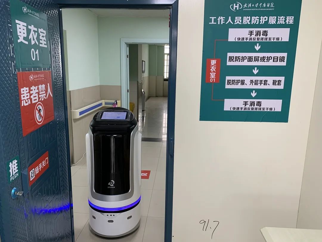2月26日,易普森医院物流消毒机器人在中南医院重症监护室正式上岗,承担护士站到重症新肺患者病房的药品配送工作。