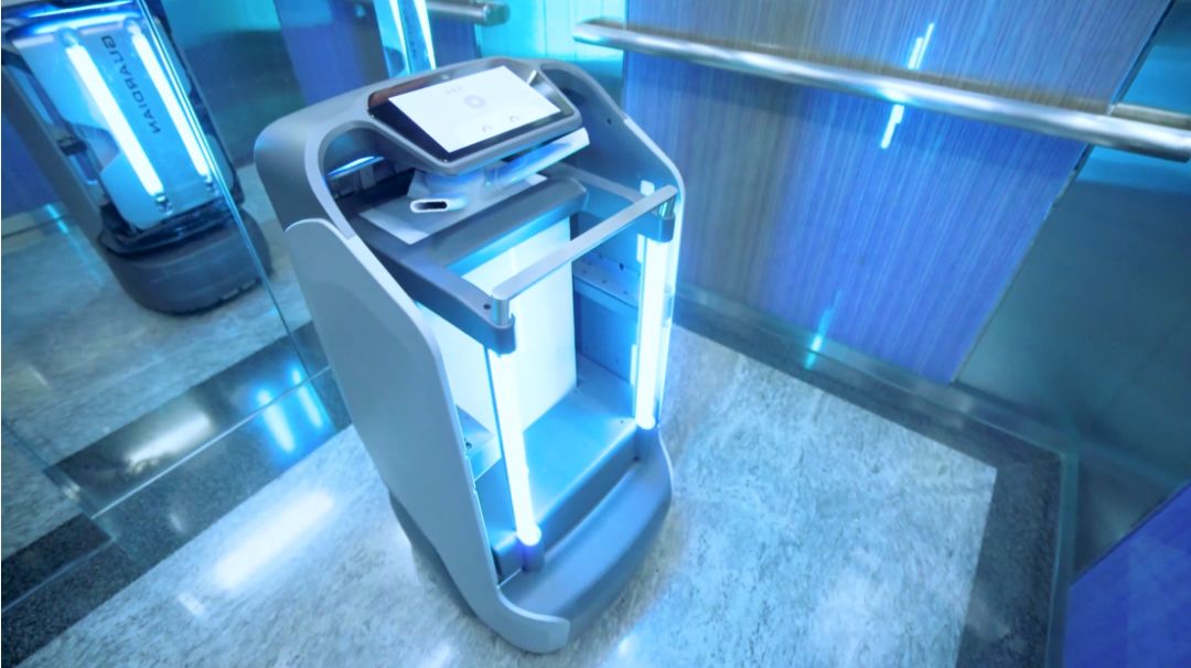 武汉金银潭医院最早启用的消毒机器人就来自YOGO,此次发布是它的2.0版。这款智能消毒机器人在原来喷雾消毒的基础上,增加了紫外线照射模式,两种模式可根据不同的场景灵活调用。针对电梯、闸机这种人流密度高的场景,机器人在无人时会自动启用紫外线照射灯,进行强化消毒;而在走廊和大厅,机器人则主要通过喷雾模式,对大场景进行循环消毒。