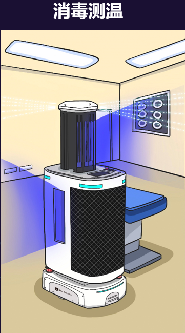 这个系统当中完全实现了无人化、无接触的器械消毒。我们仙知机器人在里面承担的角色,包括各个环节的搬送和配送。除此以外,针对医疗领域也是有一些针对性的切入,那就是基于我们仙知AMB无人搬运底盘的消毒机器人。