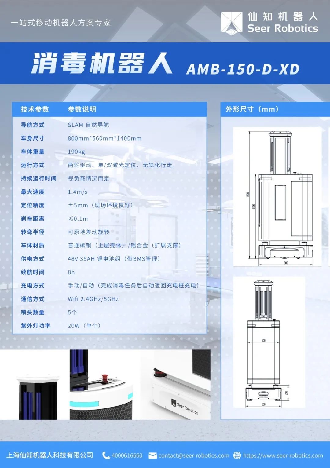 该款“消毒机器人”以仙知AMB系列无人搬运底盘为载体,集成紫外线消毒灯、超干雾过氧化氢、负氧离子净化器三种消毒方式于一体。
