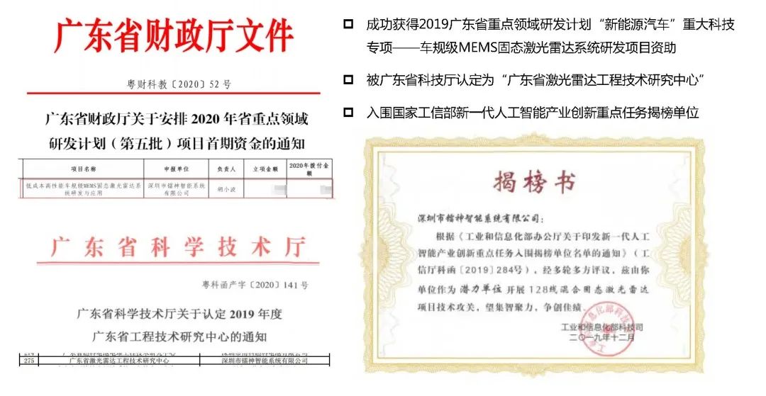 2020年开年,镭神智能旗下车规级128线混合固态激光雷达成功入选工信部新一代人工智能产业创新重点任务揭榜单位、车规级MEMS固态激光雷达成功入选广东省重点研发项目,并被广东省科技厅认定为“广东省激光雷达工程技术研究中心”。