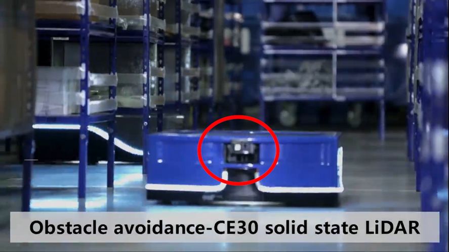 仓储AGV避障将一个CE30激光雷达安装在仓储AGV的正前方,实时监测前方障碍物,控制AGV减速或刹车,辅助其快速存取货、智能搬运等功能。
