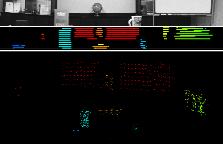 二次开发避障模式是为AGV提供障碍物的点云图,以此“描绘”出障碍物的大致轮廓。在预设情况下,CE30会输出一幅深度图和与之对应的每一个像素信号强度数据。深度图中每个像素的深度值表示该像素对应探测点到雷达前表面的投影距离。如图6所示,分别展示了普通灰度相机拍摄的实际场景图(上)、 同一位置 CE30拍摄的深度图(中)和根据深度数据绘制的点云图(下,从略高于 CE30位置观察)。
