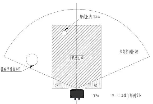 图5 自定义避障模式示意图(图中矩形区域)自定义避障模式是专门为AGV避障应用开发的模式。如图5所示,该模式下,CE30 将会为AGV筛选出最关键的避障目标,也就是警戒区内目标A,将此目标的距离信息提供给AGV。可根据客户需求定制避障区域。