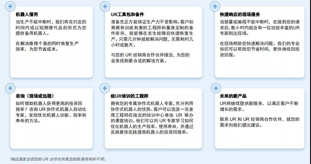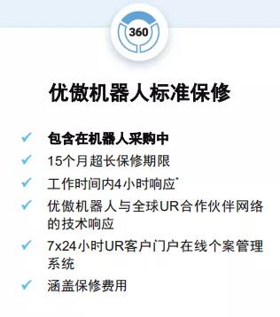| 3 | 遭遇任何突发事件都能快速恢复生产 ● 4小时响应 ● 60%的问题通过首次沟通即可解决直接联系UR生产专家 ● UR的全球经销商网络支持全球维修 ● UR的客户门户提供7x24小时在线案例管理系统,以追溯支持案例 |
