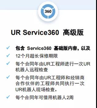 | 1 | 降低风险,控制意外开支 ● 消除意外维修和零件成本 ● 节省成本——UR Service360服务合同的成本低于平均维修成本 ● 快速获取备用机器人,保持生产不中断 ● UR专家为您带来360°全方位客户支持体验,提供完整持久的解决方案 ● 通过远程和现场机器人检查,最大限度地提高机器人的投资回报率 |