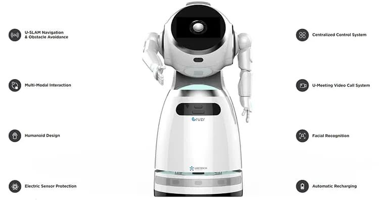 据报道,UBTECH机器人“在患者和医生之间提供视频会议服务,监视来访者和患者的体温,并对指定区域进行消毒。”