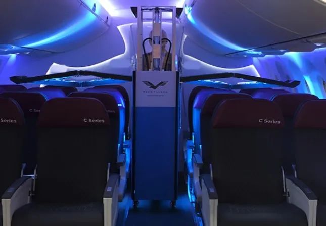 GermFalcon是世界上第一个为飞机设计的UV-C系统。该机器人由位于洛杉矶的Dimer UVC Innovations开发,可以在两次飞行之间的几分钟内迅速对飞机的内表面进行消毒。
