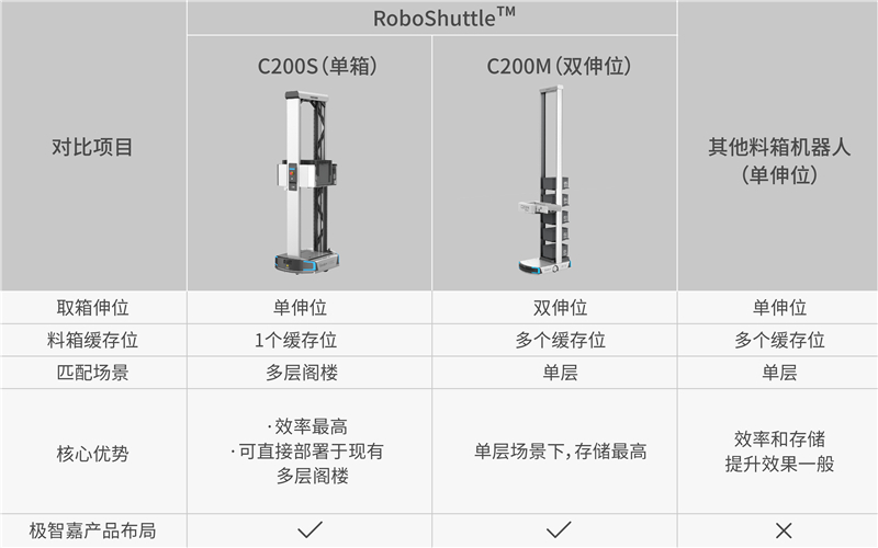“C200S和C200M是极智嘉RoboShuttle®系统针对不同场景推出的两种适配方案。C200S 适用于多层立体存储方案,C200M适用于单层存储方案。”