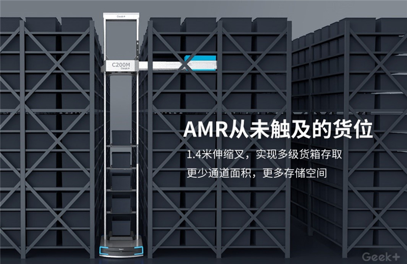 继首个多楼层存拣方案引爆业界之后,今年4月极智嘉再次扩充RoboShuttle®产品线,在料箱机器人领域重磅出击,发布全球首款双伸位、窄巷道、广立体覆盖的货箱到人机器人C200M, 打造了迄今为止单层存储能力最强的AMR解决方案。