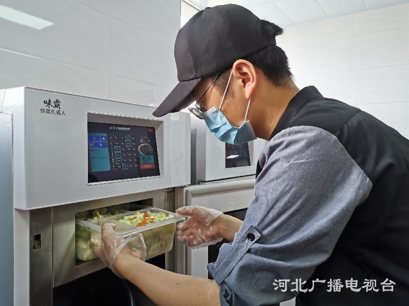 在张家口市经开区东方一茶一饭餐厅内,记者看到工作人员忙碌着,食客们分桌而坐正在享受美食。与其他餐厅不同,这里没有传统的厨房和厨师,所有的菜品都是由4台名叫“味霸”的炒菜机器人完成的。工作人员只要熟练地将配菜放入机器内,在智能操作页面上选择菜谱和炒菜功能后,不到5分钟,热气腾腾,色香味俱全的美食就出锅了。