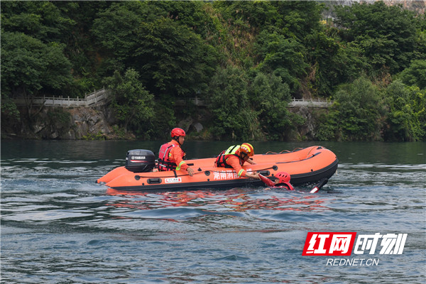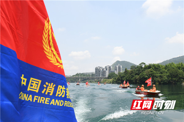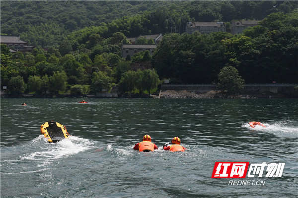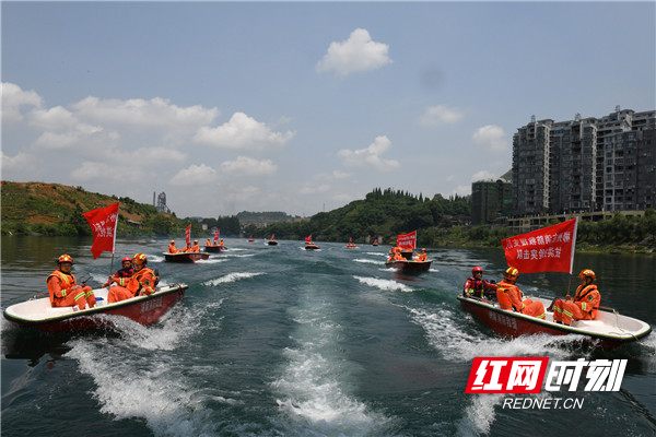 这是发生在郴州市防汛减灾应急演练中的一幕,演练假设东江湖因持续强降雨导致水位暴涨,来不及转移的群众被困孤岛,惊慌之余数人落水,另有数人坠入湖中不知去向。郴州市消防救援支队接警后,调集约80名指战员携带装备器材火速赶往集结点。到达集结点后,各参演单位按照任务分工迅速开展灾情侦查、目标搜救等实战训练科目。