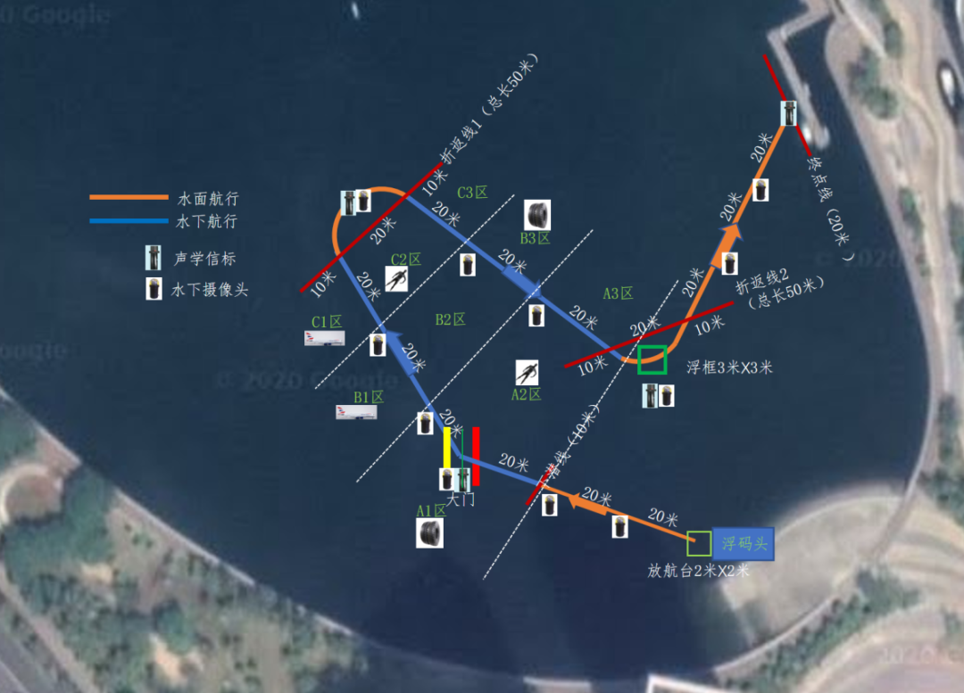 海底巡线竞速赛在真实的海洋环境中设置赛道,赛道设有出发门、终点线和浮框,在出发门和终点浮框下面布设有声学发声器,通过机器人识别跟踪声源位置完成比赛任务,赛道终点浮框由四个浮体立柱和四方形漂浮方框组成。通过设37.5KHz黑匣子水声发声器,引导机器人航行抵达终点浮框位置,浮出水面,沿水面折返至起点完成比赛。