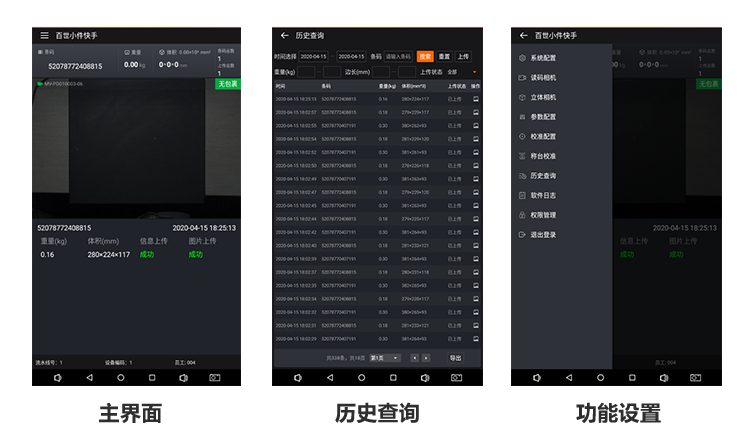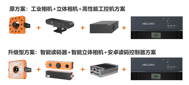 升级版方案智能读码一体化套件内置深度学习芯片,搭载了海康深度学习读码算法,可直接输出包裹条码信息,新一代双目立体相机将体积测量算法内置于相机内部,可通过SDK接口直接获取体积数据,无需后端PC处理。方案对工控环境的需求大幅降低,采用一颗安卓主板控制器即可完成数据融合输出。