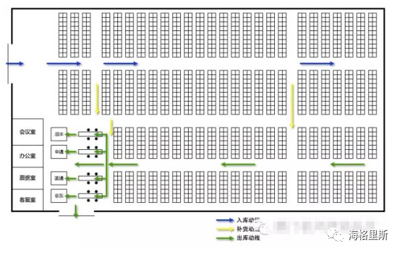 物流动线的设计原则,是让入出库及库内的作业有一个统一标准的方向,不重叠不冲突,拣选路径不重复不跳转……因为很多人可能不知道,“人的行走时间”占整个仓库业务管理一天当中一半以上的时间,而“重复行走”又是占行走时间的一大部分;因此仓库管理人员用尽一切办法来提高这一块的效率:最最原始的是保证人员行走不磕碰不相撞、库内搬运不倒货不掉货等等,其次规划设计好业务管理流程、用WMS系统的波次策略来优化拣选策略等等,再次投资不同层次的设备来代替人工行走、人工搬运、人工打包等等作业。