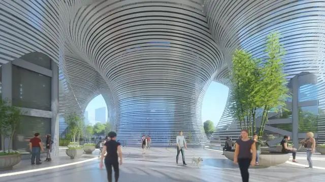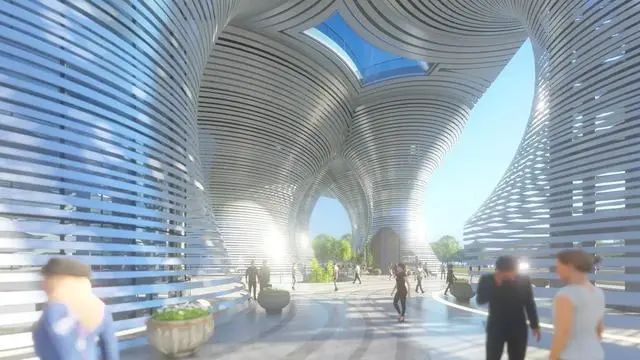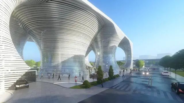 未来停车场项目,在外形上也别具一格。空间剪裁和风洞试验等先进设计手段构建出最时尚的曲面圆塔造型,数量多且弧度各不相同,地上建筑由10栋双曲面圆形镂空塔楼构成,塔楼在顶层汇聚相连,形成集休闲广场、停车设施,和屋顶花园于一体的空中空间。