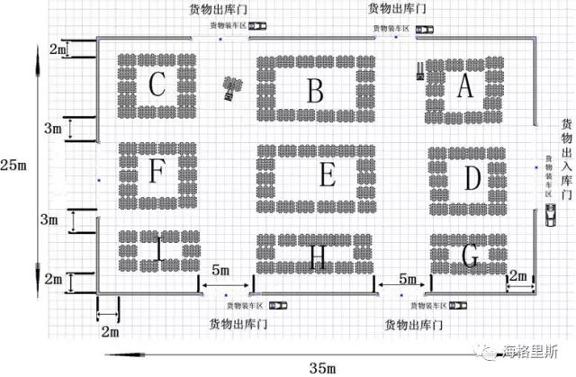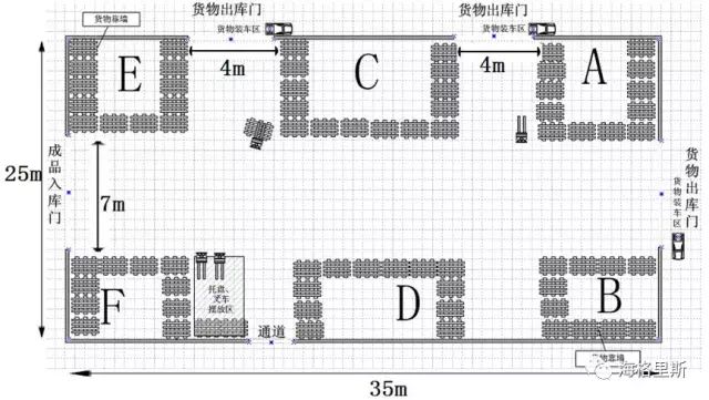 因此货物靠墙,既不影响出库效率,也可以充分利用仓库空间。此外,在仓库里面悬挂上指示牌,标明A.B.C.D.E.F区,其中以 “关键的少数和次要的多数”为理论依据划分区域,A.C区的是周转率最高,货物较多的摆货区;B.C.E区是相对较低周转率的货物摆放区;F.D区是周转率最低的货物摆放区。
