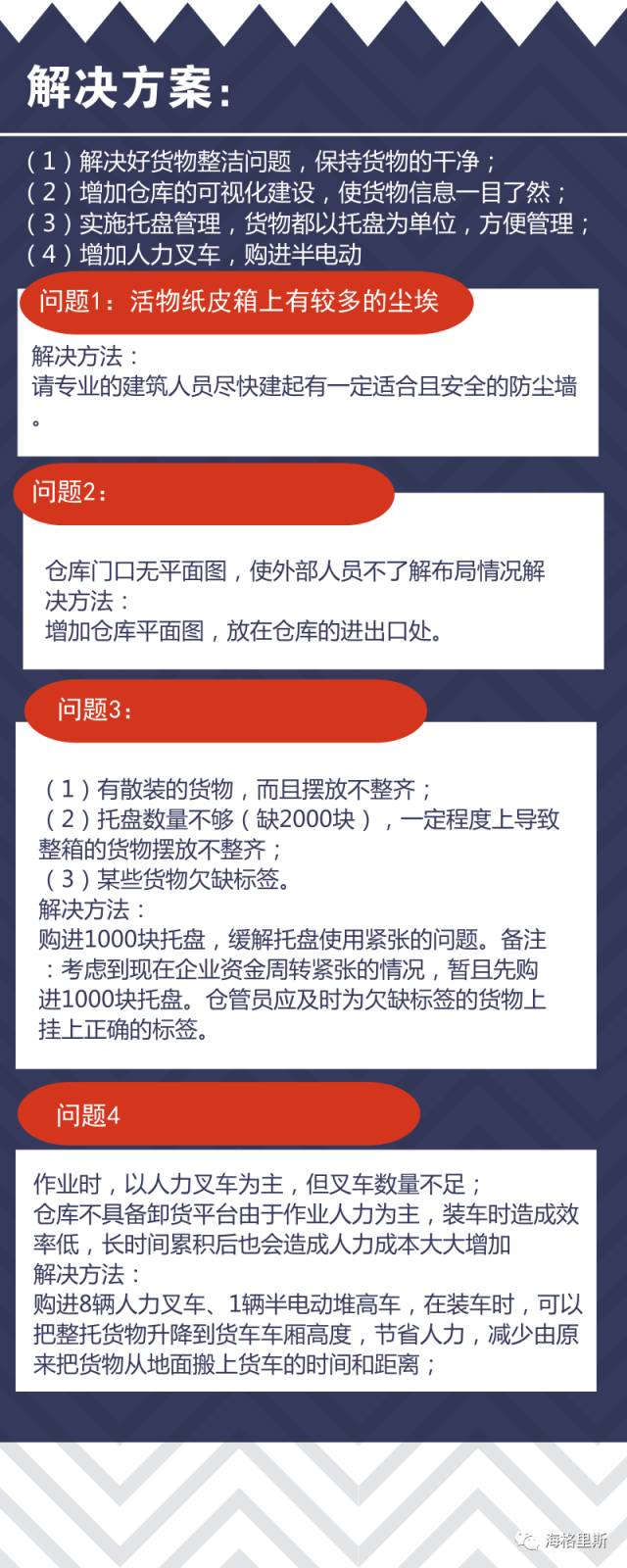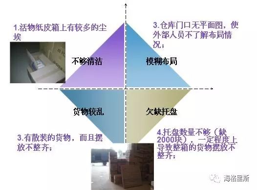 公司的仓库整体布局不合理,存货较乱,货物堆放不整齐,部分货物铺上了较多的粉尘,而且有些货物没有贴上架标签,对于出库作业会造成一定的困扰等等问题。